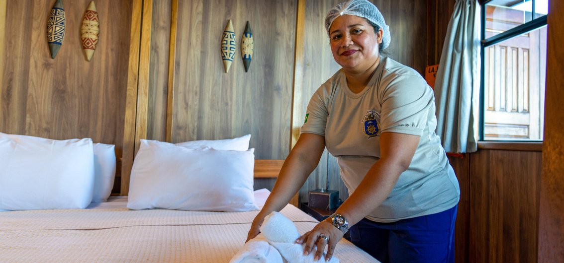 The MS Jangada anchored off Anamá during the night. After a hearty breakfast, you will discover the flora and fauna of the region on an excursion before exploring the magical western town of Anamá on foot. The MS Jangada then continues its journey towards Manaus. In the afternoon, a lecture will give you an insight into the history of the Amazon River. Your destination for the day is the Rio Januacá, in whose mouth pink dolphins often frolic.