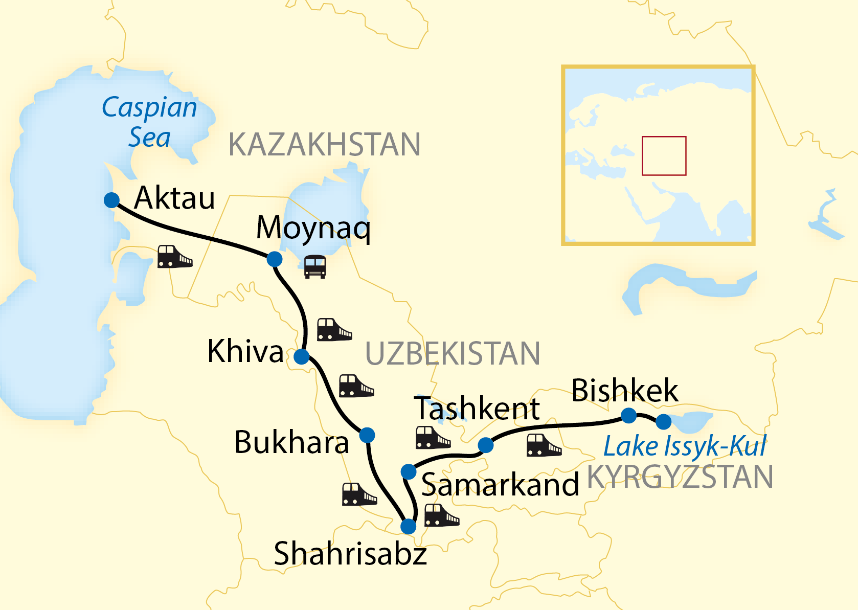Nature excursion (Valley of Balls, legendary Sherkala Mountain, Jurassic tones of Kokkala). This afternoon you go aboard: a Kazakh tea is served with traditional nomadic snacks and you overnight on board the train, continuing across the border to Uzbekistan.