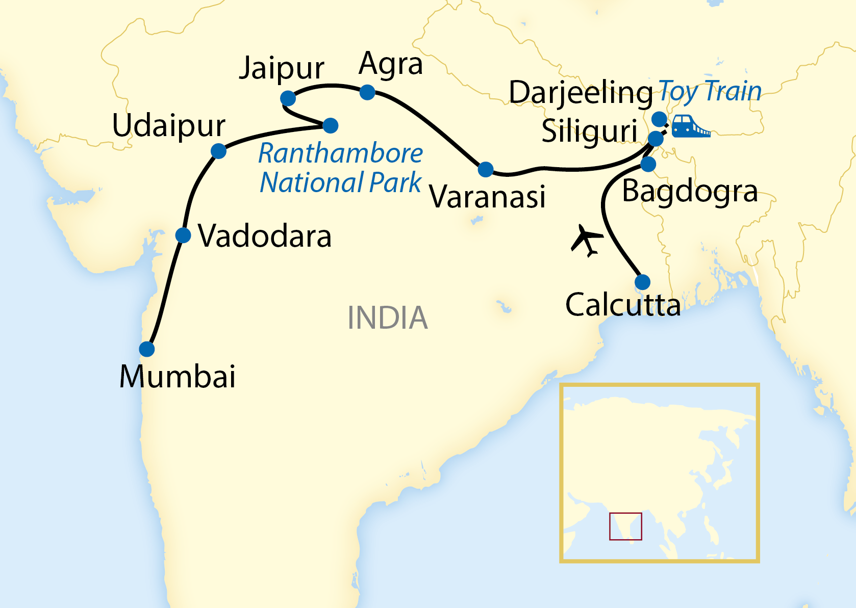 This unique route offers you a kaleidoscope of India. Your journey begins in Bengal’s metropolis Kolkata and continues by India’s most famous Toy Train to Darjeeling in the Himalayas. Discover the holy city of Varanasi on the Ganges, the breathtaking Taj Mahal and Rajasthan’s fairytale palaces. In Ranthambore you are on the trail of India’s tigers. Finally, a bang: the mega-city of Mumbai. The form of travel is also exceptional: the luxurious Deccan Odyssey has been named Asia’s best train several times.